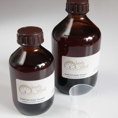 Alle tincturen vanaf 150 ml met Gold Coin Grass hebben een draai-dop, zodat je kunt schenken. Er wordt een maatbekertje mee geleverd. Zo kun je van 2,5 ml tot 20 ml doseren. Vind je het gemakkelijker om een druppelflacon te hebben? Bestel dan een leeg flesje van 50 of 100 ml inclusief druppeldop mee. Je kunt dan zelf je flesje steeds weer afvullen. Voor het afvullen, kan de druppelaar heel gemakkelijk met een mesje verwijderd worden en weer teruggeduwd worden na het afvullen.